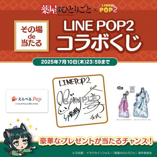期間中、「LINE POP2」の公式X(旧Twitter)をフォローして該当のポストをリポストすると、猫猫役の悠木 碧さんと壬氏役の大塚 剛央さんのサイン入り色紙や「えらべるPay500円」が抽選で当たります。