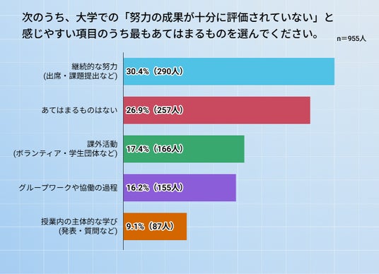 学生が「十分に評価されていない」と感じる活動の上位には、「継続的な努力(30.4%)」