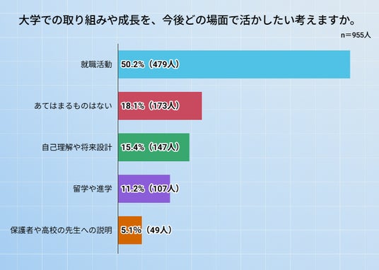 可視化された学修成果の活用先として、最も多かったのは「就職活動」(50.2%)でした。これは、