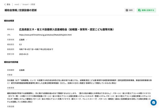 本機能により、全国の市区町村レベルでデータベース化された補助金情報を脱炭素施策ごとに確認でき、申請要件・締切・上限金額などの必要情報を迅速に把握できます。
