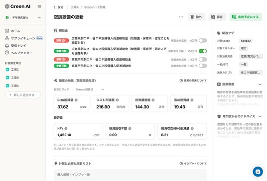 CO2削減ロードマップ策定システム『Green AI』、補助金レコメンド機能を提供開始