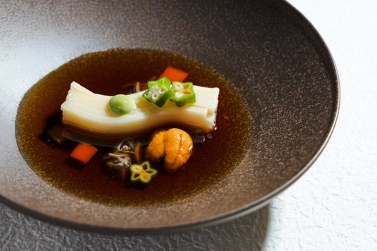 [先付]天の川豆腐 味噌だまりつゆ 雲丹、オクラ、パプリカ、ジュンサイ、山葵