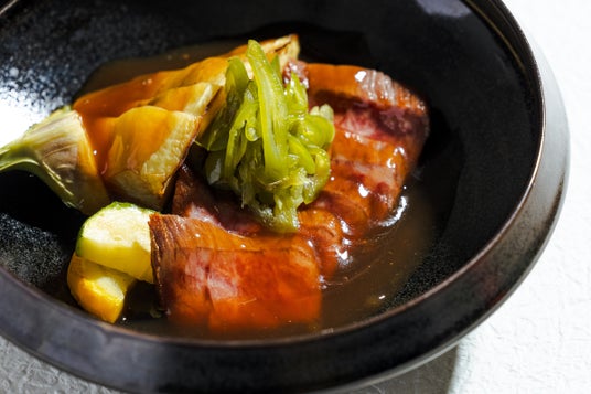 [強肴]尾崎牛と夏野菜の味噌餡掛け 絹姫茄子 万願寺唐辛子 ズッキーニ 山椒