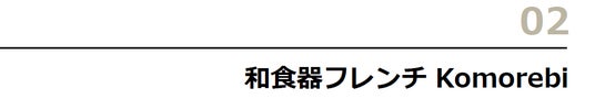 厳選食材をアンティーク和食器とフュージョンフレンチで楽しめる「和モダン」レストラン。鮮度抜群で旨味濃厚な厳選食材にこだわった、贅沢な正統派フランス料理のフードメニュー。明治や江戸時代の古伊万里や九谷焼などアンティーク和食器が料理を引き立て、リラックスしてお箸で楽しめるフレンチレストラン。
