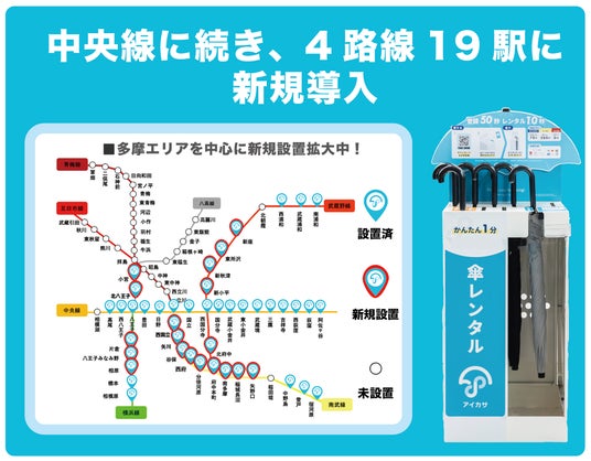アイカサ、JR東日本駅構内にて新たに19駅追加!横浜線、南武線、八高線、武蔵野線の4路線にて展開を拡大。JR駅構内一都三県で200駅へ!