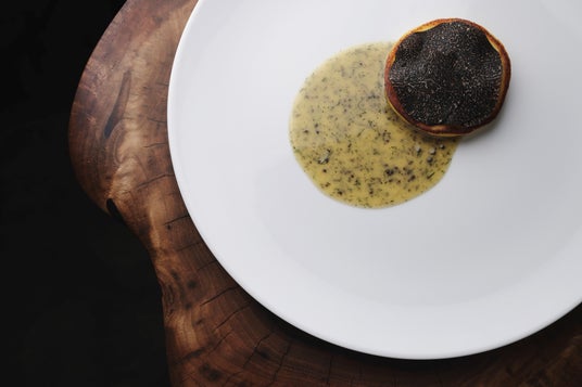 北海道のアスパラ専門農家ジェットファームの長谷川博紀氏が育てたアスパラガスを、1本で“味のグラデーション”として楽しむひと皿です。手前の穂先で素材そのものの瑞々しさを味わい、奥へ進むにつれて薄くスライスした根元部分へ。甘み・旨み・香りが凝縮した根元は、ほやのリゾットと重ね、パッションフルーツのバブルソースで香りを立たせました。上質な素材を、確かな技でより複雑な一品へ高める、レストランの姿勢を象徴する料理です。