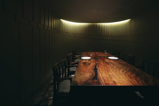 古代中国の自然哲学<五行>をコンセプトに、壁・床・家具には四角や円の規則性をあえて排し、“完結しない美” を残しました。メインダイニングの壁は丸テーブルと呼応する柔らかな曲面で覆われ、心地よいプライベート感に包まれています。家具はこの空間のために、世界で50冠以上のデザイン賞に輝く家具工房KOMAの木工家具職人・松岡茂樹氏が手がけています。