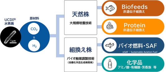 湯川が研究開発に取り組んできた「UCDI(R)水素菌」は、様々な製品を創生する画期的な微生物です。二酸化炭素CO2と水素H2から、ヒト向けタンパク、飼料、化学品、燃料の原料となる物質を高効率で創ります。