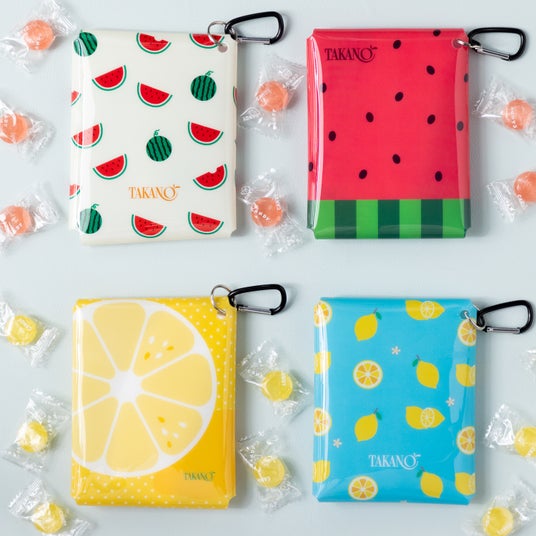 レモンとスイカの塩キャンディ入りの、フルーツ柄のビニールポーチ。カラビナ付き。