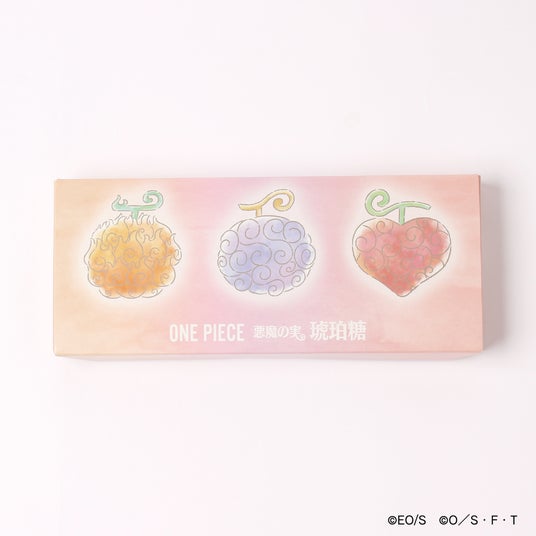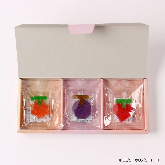 ゴムゴムの実、メラメラの実、オペオペの実をイメージした琥珀糖。シャリっとした薄いガラスのような食感とフルーツの香りが楽しめます。