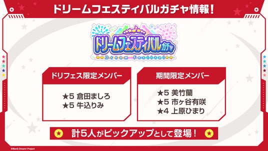 6月29日(日)15時より「ドリームフェスティバルガチャ」の開催が決定いたしました。今回のドリフェス限定メンバーとして★5倉田ましろ、★5牛込りみが登場いたします。