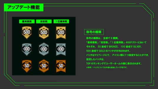 大喜利の回答の「回答数」「獲得票数」「1位獲得数」において、各条件を満たした段階に応じ「BRONZE」「SILVER」「GOLD」の称号を得ることができます。獲得した称号はバッジとして、ユーザーのアイコンに表示されます。称号・バッジについては今後も追加していく予定です。
