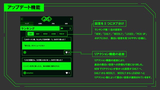 ・Topページのリニューアル「ランキング」に名称変更を実施し、面白い回答をこれまで以上にわかりやすく、見つけやすくなりました。回答は「NEW・DAILY・WEEKLY・LEGEND・PICKUP」の5つにタブ分けされます。リアクション機能として回答に「いいね」をつけることが可能になり、ユーザーからの「いいね」数に応じて「DAILY・WEEKLY・LEGEND」が選出されます。