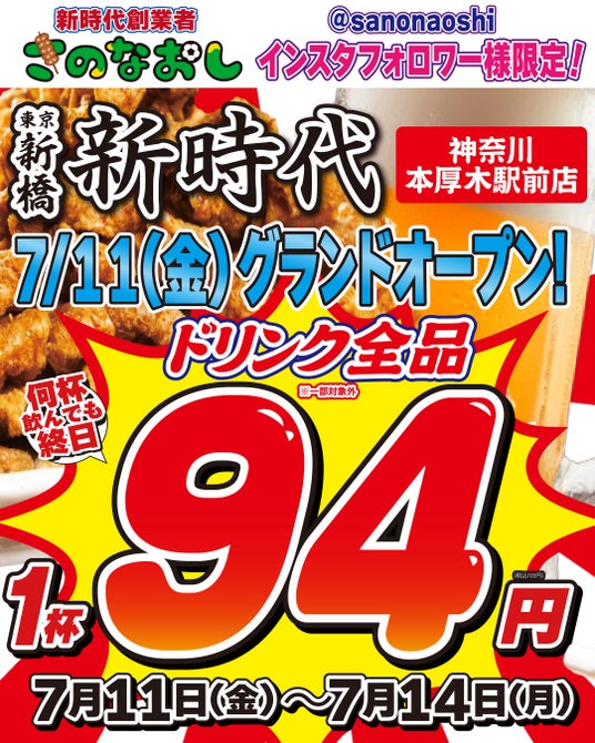 本厚木初上陸を祝しまして、7月11日(金)~7月14日(月)はメガ以外のドリンク全品、何杯飲んでも終日1杯94円(税込103円)のオープン記念イベントを開催いたします!新時代創業者「さのなおし」(@sanonaoshi)のInstagramフォロワー様限定となっております。このチャンスをお見逃しなく!