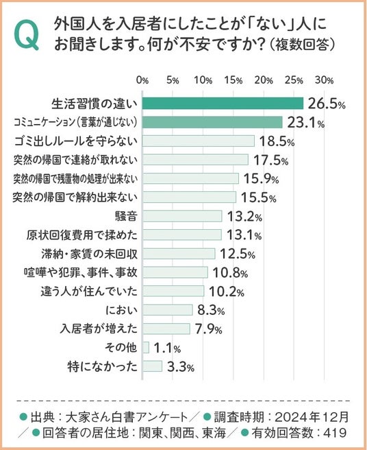 特に「生活習慣の違い」(26.5%)や「コミュニケーション(言葉が通じない)」(23.1%)といった文化・言語の壁に対する不安が大きく、日常生活上のトラブルを懸念する声が多く見られました。