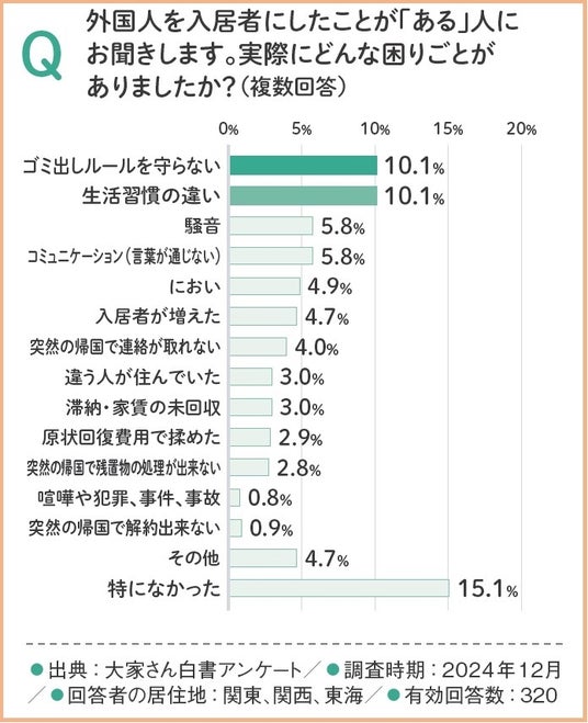 しかし、実際に外国人入居を経験した大家さんが挙げた困りごとは、「ゴミ出しルールを守らない」「生活習慣の違い」がともに10.1%、「騒音」「言葉が通じない」が5.8%、「におい」が4.9%と、不安として想定されていた割合よりも低い結果となりました。これは、大家さんが抱く不安が、実際のトラブル発生頻度よりも大きく見積もられている可能性を示しています。