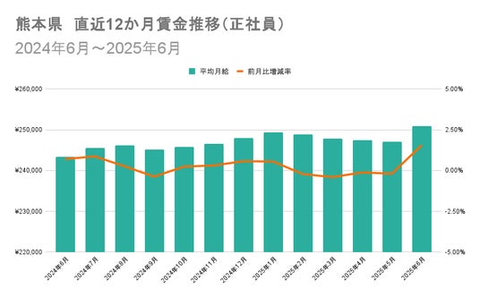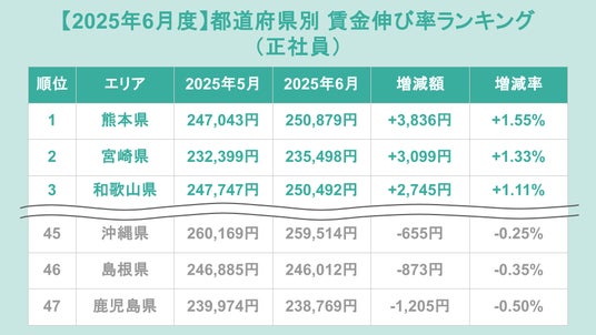 正社員の都道府県別賃金伸び率ランキング(前月比)トップ3は、1位が熊本県(増加額+3,836円、増加率+1.55%)、2位が宮崎県(増加額+3,099円、増加率+1.33%)、3位が和歌山県(増加額+2,745円、増加率+1.11%)でした。