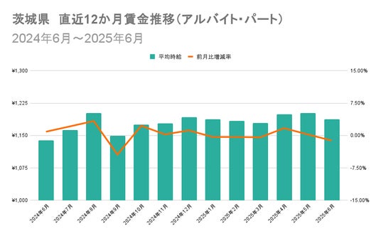 茨城県の平均時給は、2024年6月から同年にかけて大きく上昇し、同年9月にかけて減少。以後は横ばいでの推移を見せています。