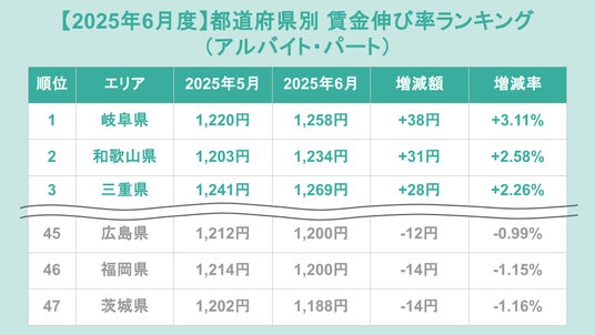 アルバイト・パートの都道府県別賃金伸び率ランキング(前月比)トップ3は、1位が岐阜県(増加額+38円、増加率+3.11%)、2位が和歌山県(増加額+31円、増加率+2.58%)、3位が三重県(増加額+28円、増加率+2.26%)でした。