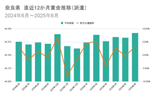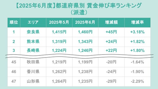 求人サイト主要9媒体から雇用形態別に分析!派遣では奈良県が前月比+3.18%で1位【2025年6月度 都道府県別 賃金伸び率ランキング】