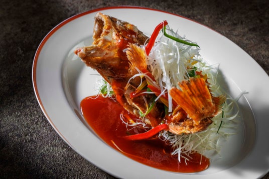 旬の魚を新鮮なまま丸揚げ。サンザシや香港の高級黒糖などでつくるオリジナルの甘酢で仕上げ、最後にさっぱりと召し上がっていただきます。