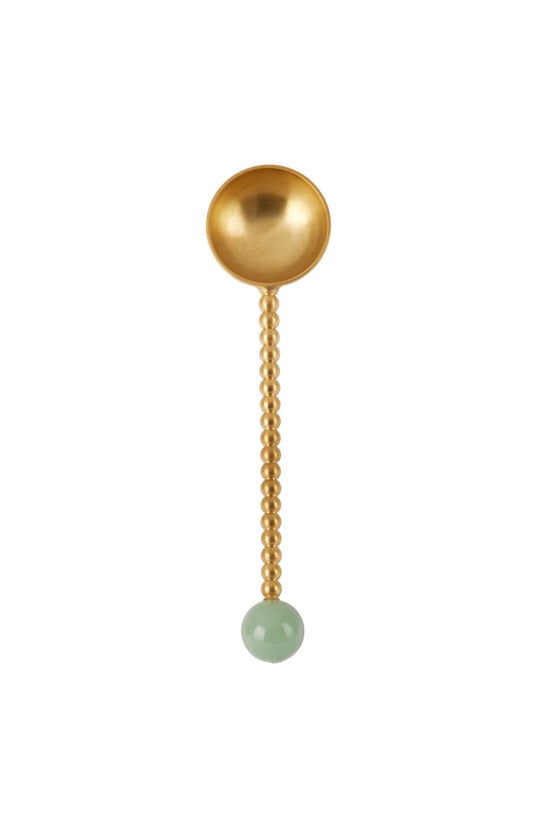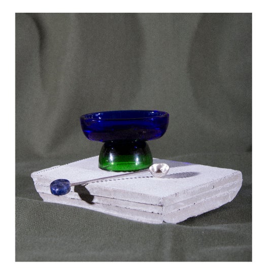 トスカーナの職人によって作られたソルトセラー。深みのあるブルーとグリーンのクリスタルが美しい小ぶりな器に、ラピスストーンをあしらったミニスプーンが、テーブルに上質な遊び心を添えます。