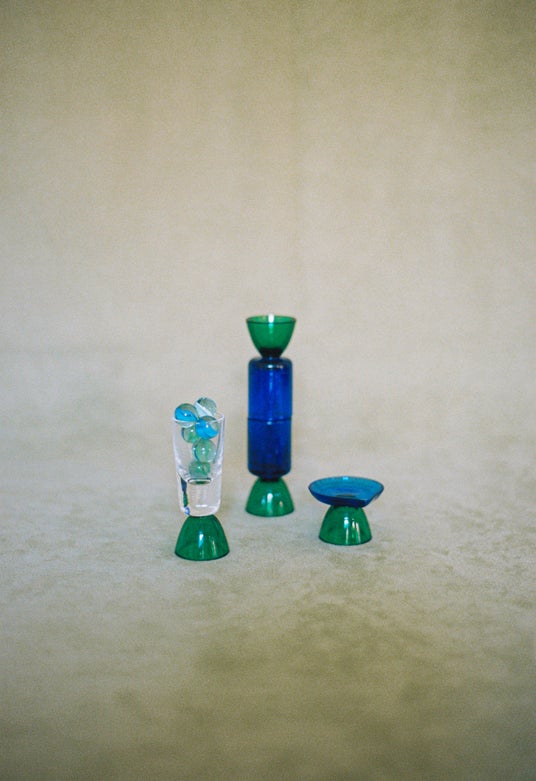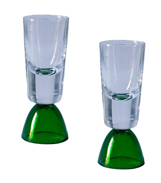 トスカーナの職人によって作られたテキーラカップ。凛とした透明感のショットグラスにグリーンのガラスベースが、シンプルでありながら立体的なフォルムにアクセントを。