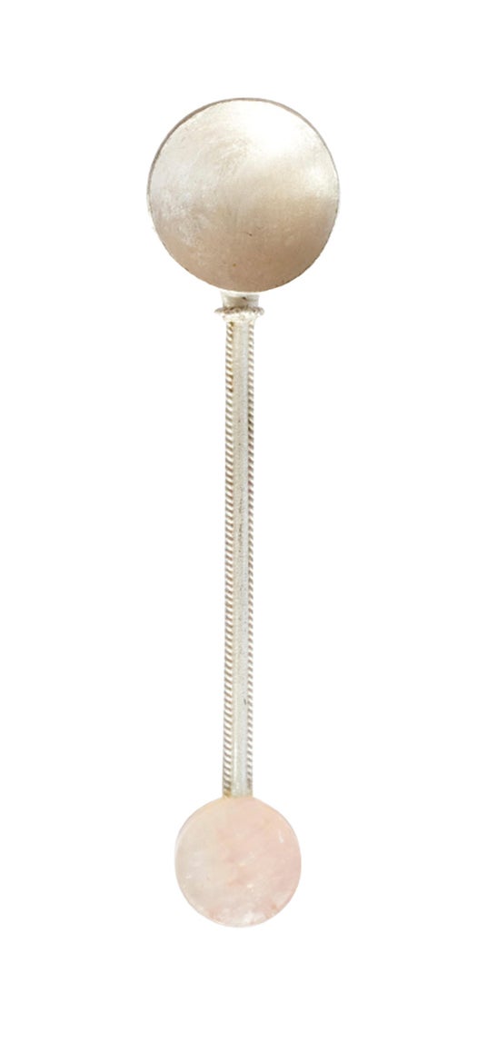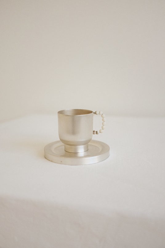繊細なホワイトストーンをパールのように連ねたハンドルが印象的なティーカップとソーサーのセット。真鍮にシルバーメッキを施したカップとソーサーは、イタリアの熟練職人による手仕事で仕上げられ、静かな輝きを放ちます。
