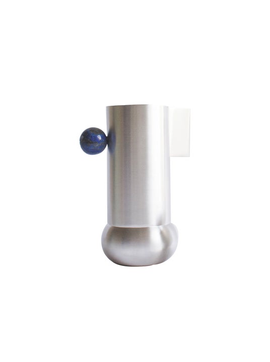 高度な旋盤(せんばん)加工技術により、真鍮のシルバーメッキがなめらかなカーブと丸みのある姿に昇華したミルクピッチャー。深い青をたたえたラピスラズリのハンドルが洗練されたアクセントになり、ティータイムのひと時を贅沢な体験に。