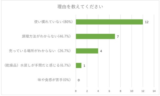 当財団が鳥取県在住の30~40代女性を中心としたヒアリング調査(25年5月実施 N=36)では、きくらげを普段の調理で「使わない」と答えた人の約8割が理由(複数回答)に「使い慣れていない」と回答。