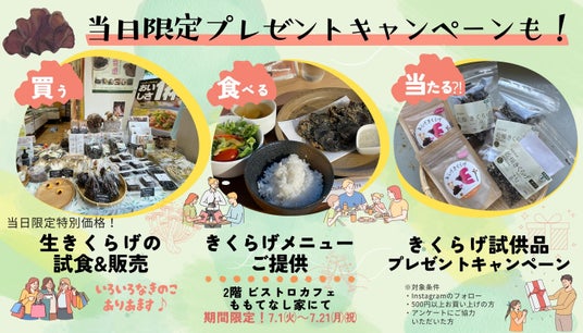 アンテナショップ2階のレストラン「ビストロカフェももてなし家」では、2025年7月1日(火)~21日(月・祝)の3週間、県産生きくらげを使ったオリジナルメニューを4品提供予定。