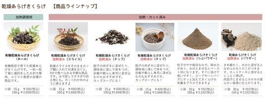当財団では、2023年より乾物ならではの“水戻し”の手間と時間を解決し、より手軽にきくらげを食べていただきたいという思いで“加熱・カット済み”の商品を開発してきました。(スライス、チップ、ダイスカット、パウダー)
