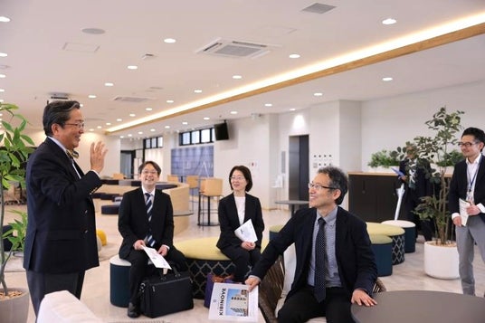 共創イノベーションラボ(KIBINOVE)5階のイノベーション創出フロアで、那須学長の説明を聞く藤原事務次官