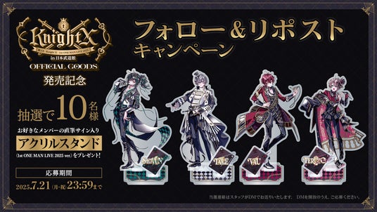 オフィシャルグッズの発売を記念して、各メンバーの公式Xにてフォロー&リポストキャンペーンを実施いたします!キャンペーンに応募いただいた方の中から抽選で10名様にお好きなメンバーの直筆サイン入り「アクリルスタンド」をプレゼント!!