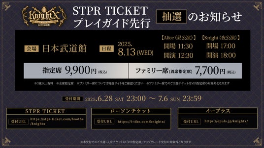 株式会社STPR (本社:東京都渋谷区 代表:柏原真人、以下STPR)は、弊社所属のビジュアル系2.5次元歌い手グループ「騎士X - Knight X -」が日本武道館にて開催する自身初のワンマンライブについて、2025年6月28日(土)23:00よりSTPR TICKET先行受付、プレイガイドでの先行受付、そして『VIP指定席』へのアップグレード受付を開始いたしました。あわせて、オフィシャルグッズ情報や各種キャンペーン情報も公開いたしました。