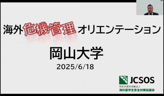 国立大学法人岡山大学(本部:岡山市北区、学長:那須保友)は、2025年6月18日、海外渡航を予定する学生やその関係部局を対象に「危機管理ガイダンスおよび海外留学保険説明会」をオンラインにて開催し、教職員・学生あわせて122人が参加しました。