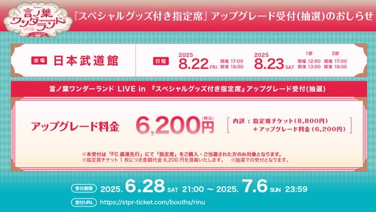 これに先立ち、2025年6月28日(土)21:00からSTPR TICKET先行と『スペシャルグッズ付指定席』アップグレードの受付を開始いたしました。『スペシャルグッズ付指定席』アップグレードは「FC最速先行」で「指定席」をご購入・ご当選された方のみが対象となります。