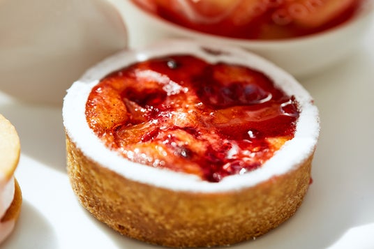 西洋プラムとも呼ばれるミラベルをフランボワーズとともにじっくり焼き上げた甘酸っぱいタルト。