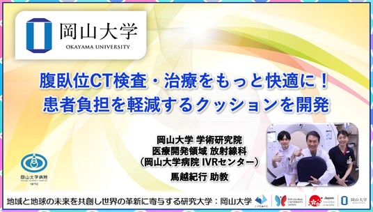 国立大学法人岡山大学(本部:岡山市北区、学長:那須保友)の学術研究院医療開発領域放射線科(岡山大学病院 IVRセンター)馬越紀行助教らの研究グループは、アズワン株式会社(大阪市)との共同研究により、腹臥位での検査・治療時に患者の負担を軽減する腹臥位用胸部クッションを研究開発しました。