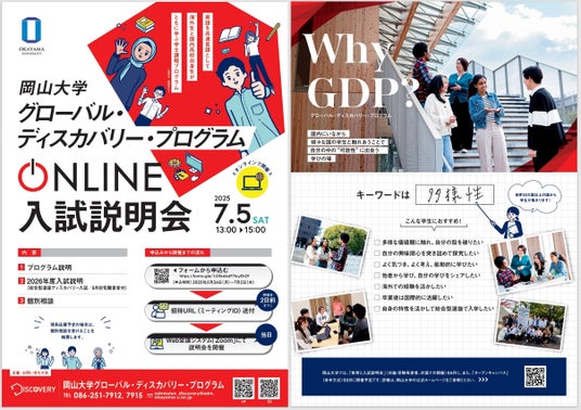 国立大学法人岡山大学(本部:岡山市北区、学長:那須保友)では、世界各国から集まる海外生(留学生・帰国生など)と国内高校の出身生が英語を共通言語としてともに学ぶ学士課程プログラム、グローバル・ディスカバリー・プログラム(GDP)がオンライン入試説明会を、2025年7月5日(土)13:00~15:00に開催します!