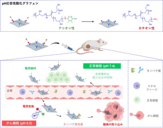 - 本研究では、グラフェン表面に親水性高分子ポリグリセロールを修飾し、pH応答性の電荷反転型ナノマテリアルを開発しました。腫瘍の酸性環境下で正に帯電し、がん細胞への取り込みを促進します。