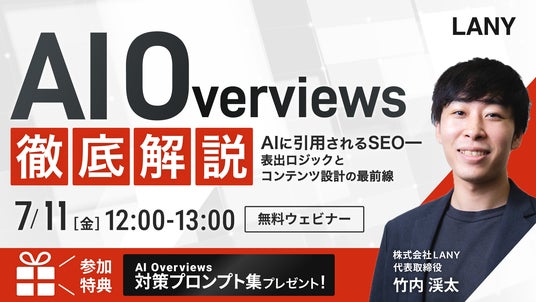デジタルマーケティング支援を提供する株式会社LANY(東京都渋谷区、代表取締役社長:竹内渓太)は、【無料ウェビナー】AI Overviews徹底解説|AIに引用されるSEO━表出ロジックとコンテンツ設計の最前線を7/11(金)に開催いたします。