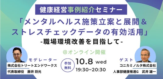 株式会社トリートエンドワークス(所在地:東京都渋谷区、 代表取締役:藤井将光)は、「健康経営 事例紹介セミナー」を2025年10月8日(水)19時30分~20時30分にオンライン開催いたします。本セミナーは、企業の健康経営の重要ポイント「メンタルヘルス領域」に焦点を当てた「ストレスチェックや職場環境改善」に関する内容です。主に事業者や健康経営推進者・人事担当者・管理監督者・産業保健スタッフなど企業にお勤めの方を対象に企画しています。その他、健康経営やメンタルヘルス対策にご興味のある方もお気軽にご参加ください。
