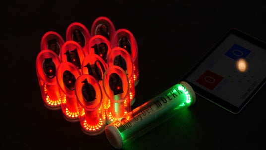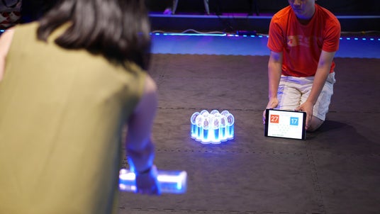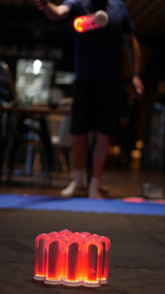 Cyber MOLKKYは、フィンランド発祥のスポーツ「モルック」をベースに、LED・センサー・サウンド演出を融合させたスポーツです。サイバーモルック棒とスキットル(12本のピン)に内蔵されたセンサーが各ピンの状況をリアルタイムに検出判定し、光・音・画面で試合状況を演出。ルールはシンプルながら、誰でも直感的に楽しめる内容となっています。