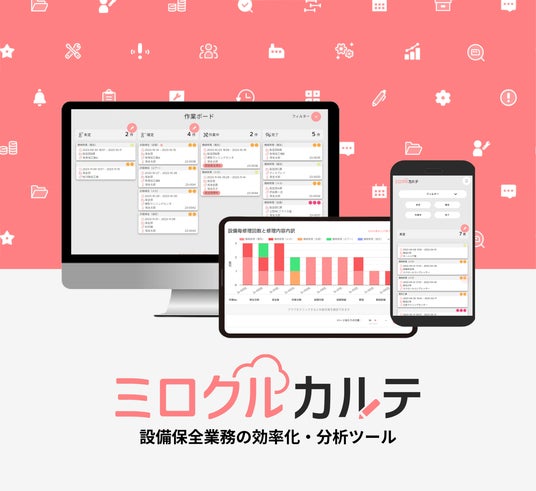 設備保全クラウド「ミロクルカルテ」は、「計画保全」「事後保全」「予備品管理」「日常点検」など、保全業務全般の効率化を支援するクラウドサービスです。さらに単なる効率化にとどまらず、「作業履歴」や「分析」などの機能を活用することで、故障の予防や保全業務の継続的な改善にも貢献します。