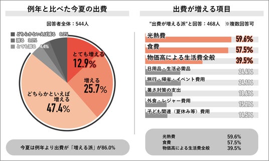 回答者全体の544人に、例年と比べた今夏の出費を聞くと「増える派」が86.0%で多数派となり、内訳は「とても増える」が12.9%、「増える」が25.7%、「どちらかといえば増える」が47.4%となりました。また、出費が増えると回答した468人にその項目を聞くと、「光熱費」が59.6%で最多となり、次いで「食費」が57.5%、「物価高による生活費全般」が39.5%となりました。
