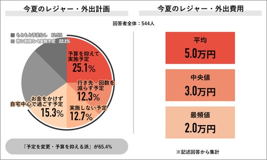 回答者全体の544人に、今夏のレジャー・外出計画を聞くと、「予定を変更・予算を抑える派」が65.4%で多数派となり、内訳は「予算を抑えて実施予定」が25.1%、「行き先・回数を減らす予定」が12.3%、「実施しない予定」が12.7%、「お金をかけず自宅中心で過ごす予定」が15.3%となりました。また、今夏のレジャー・外出費用を聞くと、平均額が5.0万円、中央値が3.0万円、最頻値が2.0万円となりました。
