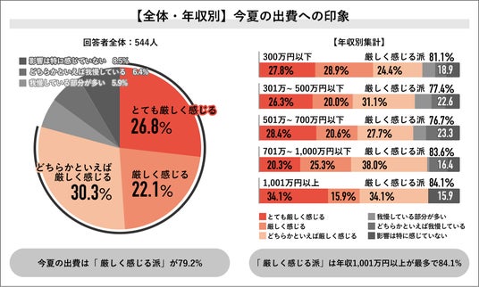 回答者全体の544人に、今夏の出費への印象を聞くと、「厳しく感じる派」が79.2%で多数派となり、内訳は「とても厳しく感じる」が26.8%、「厳しく感じる」が22.1%、「どちらかといえば厳しく感じる」が30.3%となりました。「今夏の生活費が厳しく感じる派」の年収別では、「1,001万円以上」が84.1%で最多となり、次いで「701万~1,000万円以下」が83.6%、「301万~500万円以下」が77.4%、「501万~700万円以下」が76.7%となりました。