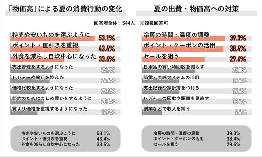 回答者全体の544人に”物価高”による夏の消費行動の変化を聞くと、「特売や安いものを選ぶように」が53.1%で最多となり、次いで「ポイント・値引きを重視」が43.4%、「外食を減らし自炊中心に」が33.6%となりました。また、夏の出費・物価高への対策を聞くと、「冷房の使用時間・温度の調整」が39.3%で最多となり、次いで「ポイント・クーポンの活用」が38.4%、「セールを狙う」が29.6%となりました。