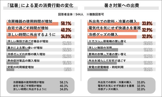 回答者全体の544人に”猛暑”による夏の消費行動の変化を聞くと、「冷房機器の使用時間が増加」が58.1%で最多となり、次いで「自宅で過ごす時間が増加」が40.3%、「涼しい時間に外出するように」が34.0%となりました。また、暑さ対策への出費を聞くと、「外出先での飲料・冷菓の購入」が33.8%で最多となり、次いで「電気代を気にせず快適さを重視」が32.9%、「冷感グッズの購入」が32.0%となりました。